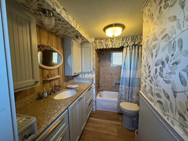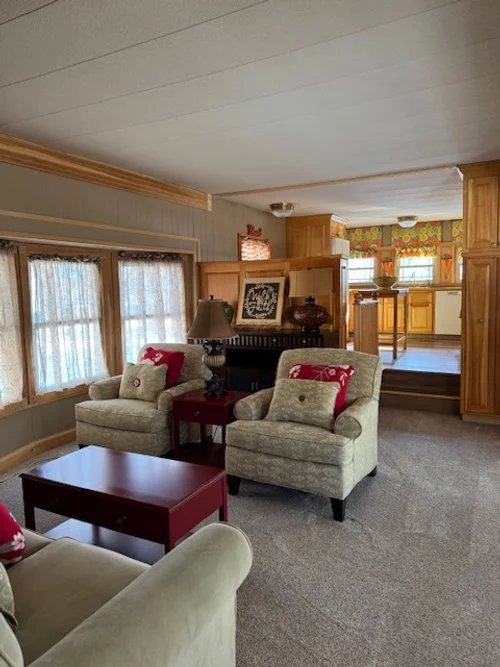 Great opportunity to live in this highly desirable 55+ co-op community. This Virginia double wide home has 1568 sq ft. Open floor plan and cathedral ceilings throughout the living area, 2/B 2/B, fireplaced living/dining area. Primary bedroom has cedar lined closet and large primary bath. The large living/dining area will allow for lots of entertaining. This residence is ready for your new decorating ideas.